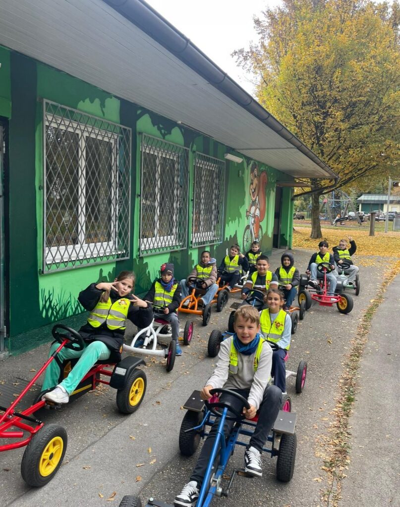 Mit den Go-Karts konnten die Kinder ihre ersten Erfahrungen im Straßenverkehr sammeln. Unterstützt wurden sie dabei von Polizistinnen und Polizisten, die anschaulich erklärten, wie gefährlich der „tote Winkel“ sein kann.